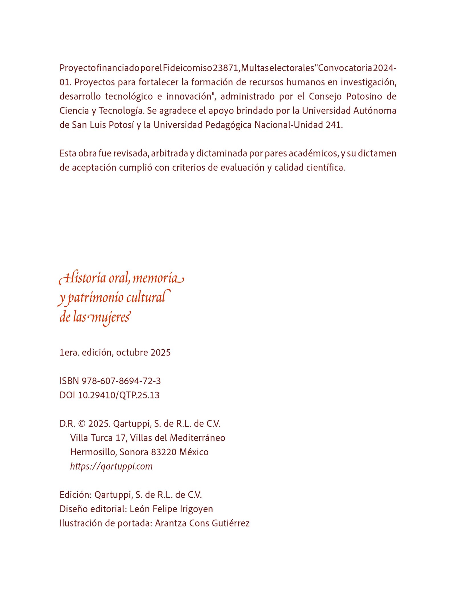 Vega, B., & Ramos, N. (Coords.). (2025). Historia oral, memoria y patrimonio cultural de las mujeres. Qartuppi. http://doi.org/10.29410/QTP.25.13
