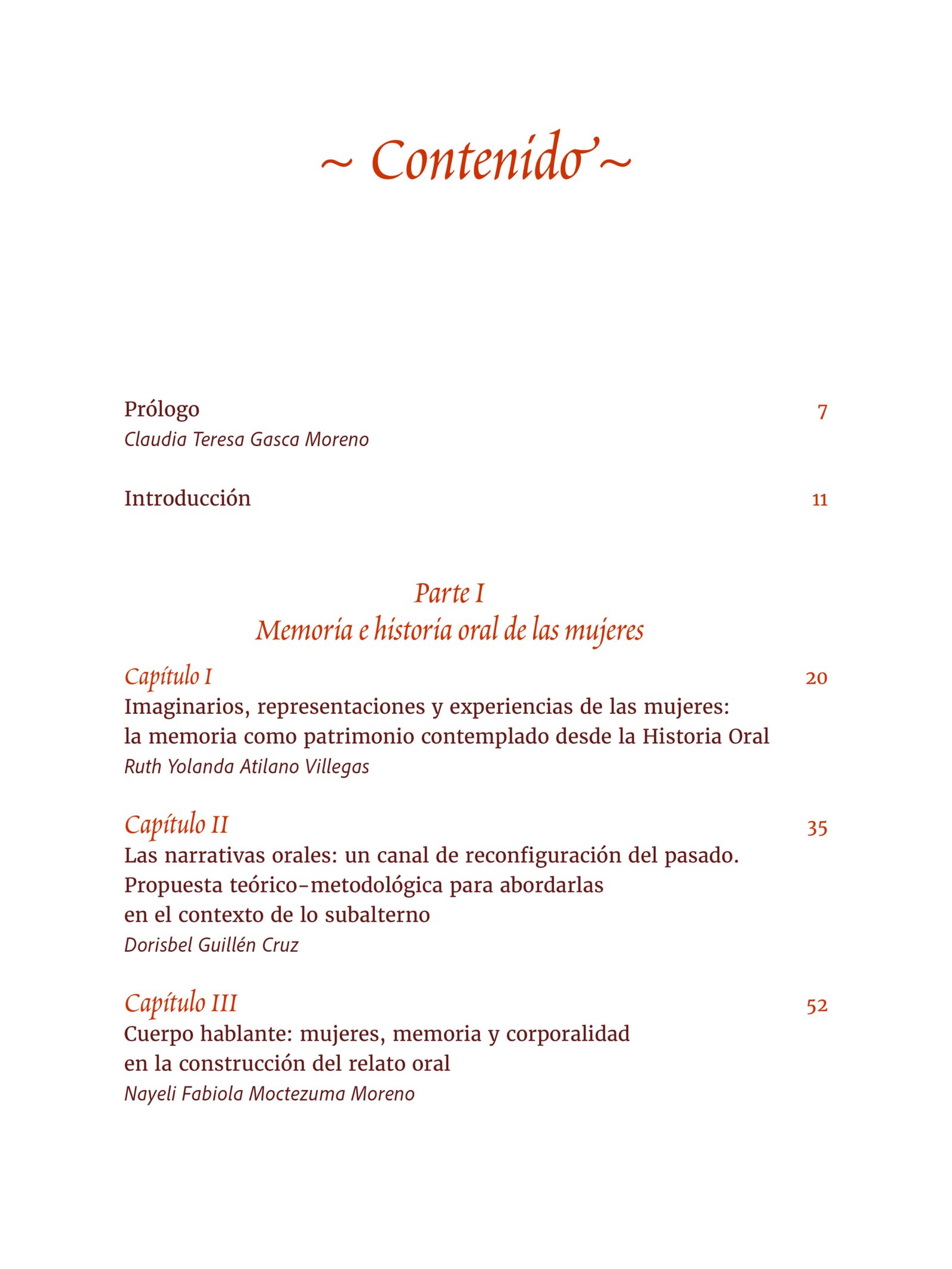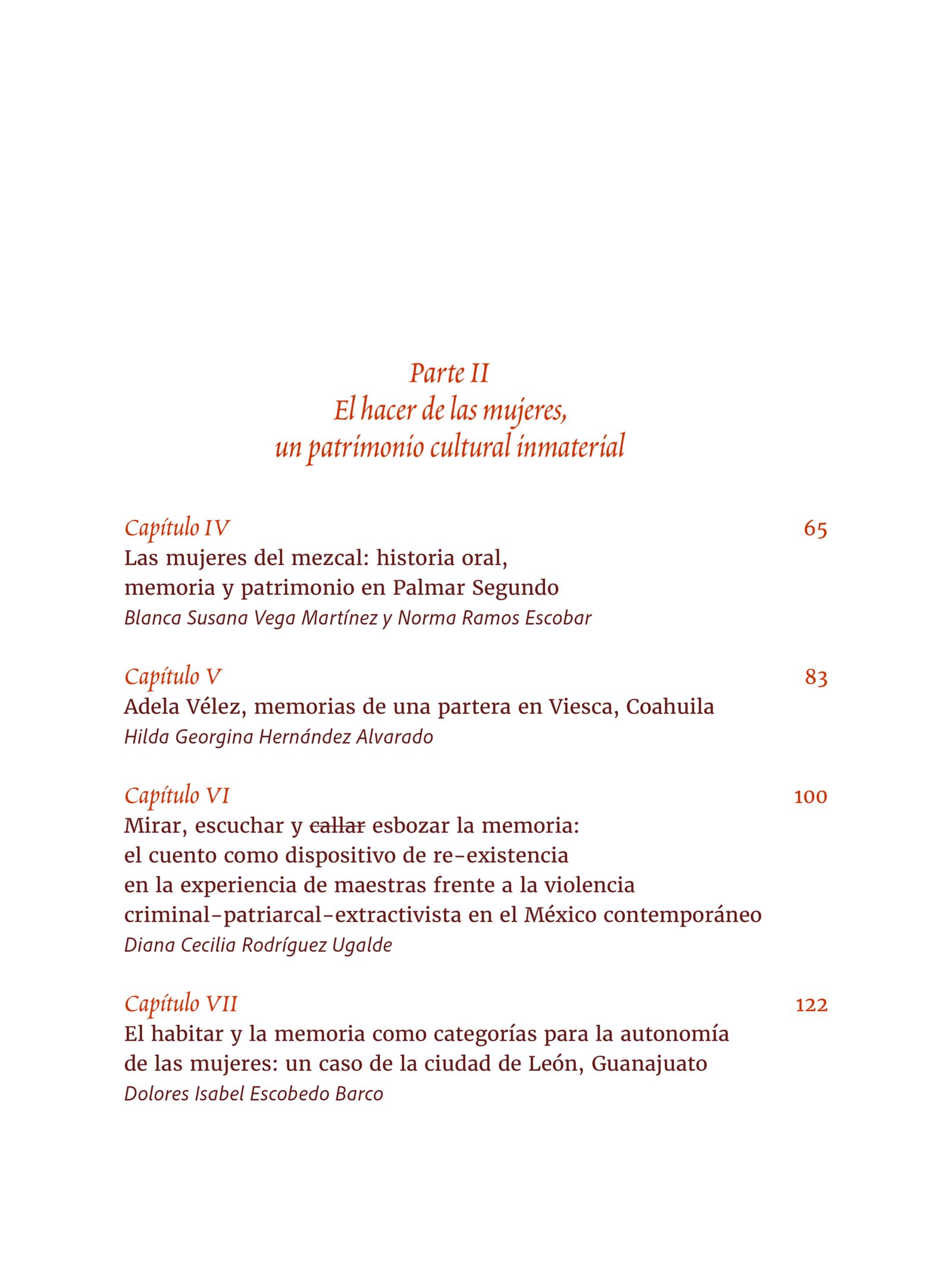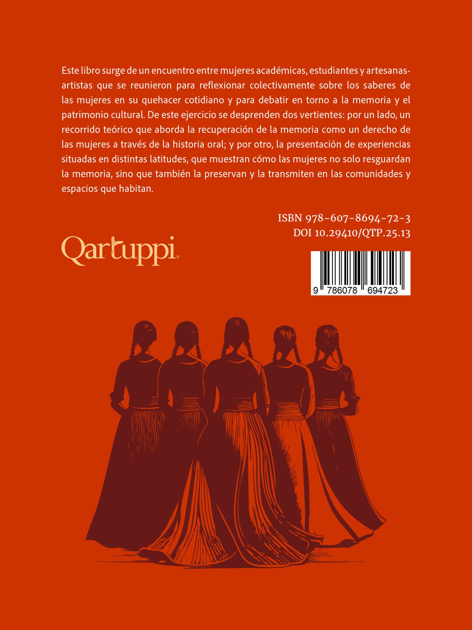 Este libro surge de un encuentro entre mujeres académicas, estudiantes y artesanas-artistas que se reunieron para reflexionar colectivamente sobre los saberes de las mujeres en su quehacer cotidiano y para debatir en torno a la memoria y el patrimonio cultural. De este ejercicio se desprenden dos vertientes: por un lado, un recorrido teórico que aborda la recuperación de la memoria como un derecho de las mujeres a través de la historia oral; y por otro, la presentación de experiencias situadas en distintas latitudes, que muestran cómo las mujeres no solo resguardan la memoria, sino que también la preservan y la transmiten en las comunidades y espacios que habitan.
