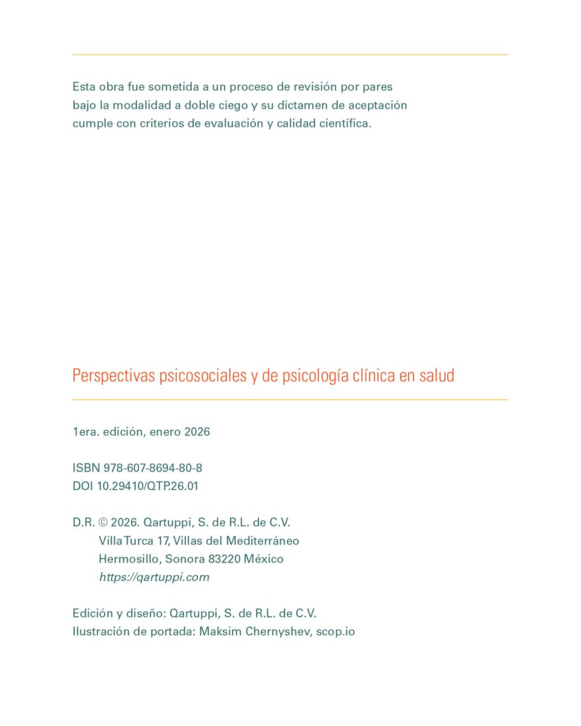 Avalos, M. L., Martínez , M. S., & Ramírez, J. C. (Coords.). (2026). Perspectivas psicosociales y de psicología clínica en salud. Qartuppi. http://doi.org/10.29410/QTP.26.01