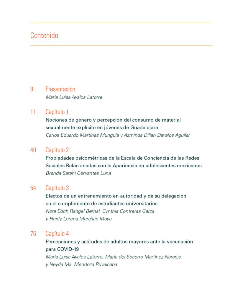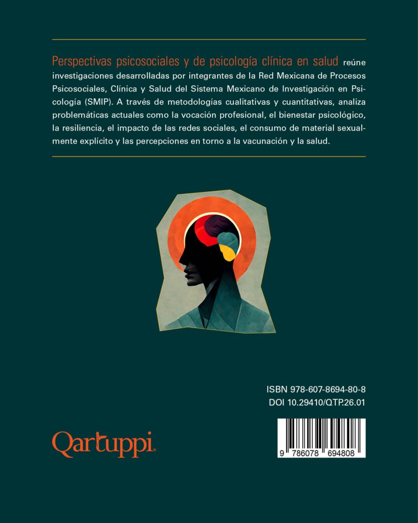 Perspectivas psicosociales y de psicología clínica en salud reúne investigaciones desarrolladas por integrantes de la Red Mexicana de Procesos Psicosociales, Clínica y Salud del Sistema Mexicano de Investigación en Psicología (SMIP). A través de metodologías cualitativas y cuantitativas, analiza problemáticas actuales como la vocación profesional, el bienestar psicológico, la resiliencia, el impacto de las redes sociales, el consumo de material sexualmente explícito y las percepciones en torno a la vacunación y la salud.